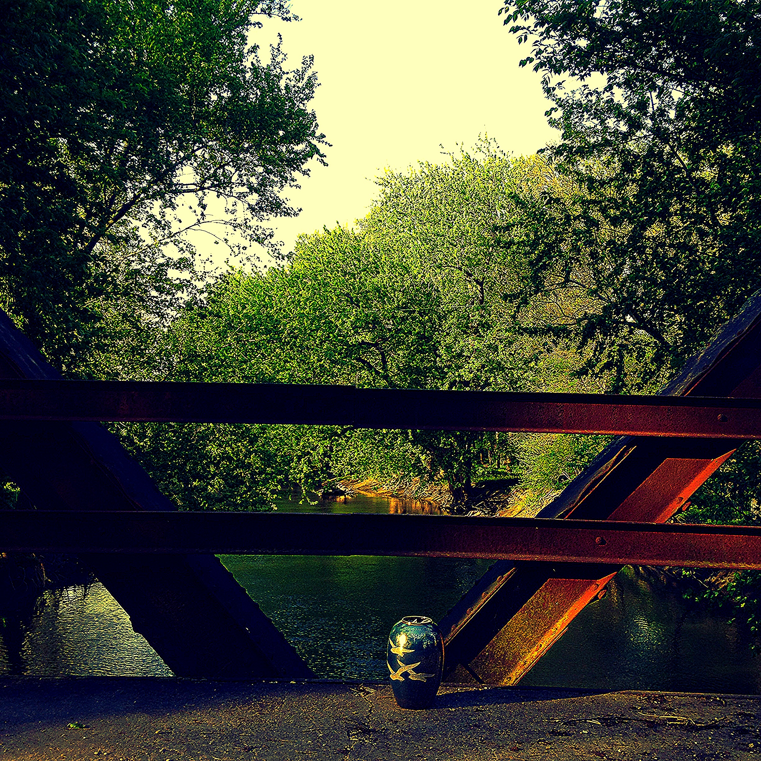 It was the perfect May day, warm enough for jeans and a t-shirt, sunny, the sweetness of wild phlox and fresh growing things in the air. We drove past our old house and barn to where the old iron bridge still stands, though cars can’t drive over it because it is blocked with a sign that says, “Road Ends.” We walked along the river, onto the bridge, which seemed just as sturdy as it was 35 years before when we lived there, when we rode horses across it. I am surely not the first to remark on this, but I was struck by the amount of ashes that fit into a small urn. We tried to be aware of the wind, but still I got ashes on my sandaled feet.