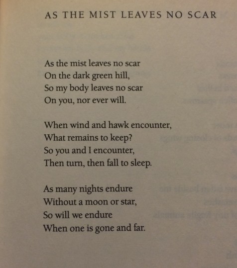 My favorite was “As the Mist Leaves No Scar” (full text below), which I found heartbreakingly beautiful. Contrary to stereotypes, he liked the sentimental, “We’ll always be together” love poem and I liked the “Don’t take it too seriously, this is just a function of nature” love poem. Beyond us shattering myths with our choices, I suppose that when our favorite love poems were thematically opposed we should have at least wondered whether that was a sign. But back then I only saw in words what I wanted to see.
