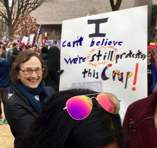 We are women who have endured body shaming, sexism, lookism, sexual discrimination, homophobia, and sexual assault. Women who have been there, done that. We are not only still standing, but marching. We are women with children, women without children, women with grandchildren, women who’ll never have grandchildren, women with partners, women without partners, women with careers, women without careers, women with hobbies, women with careers and hobbies, women with degrees, women without degrees, women who teach, women who are being taught, women finding our way, women finding our way again, women who always find our way, women who are the way, women who are showing the way. You know. Women like any other group of women who had gathered to march together that day to Protect Women’s Rights.