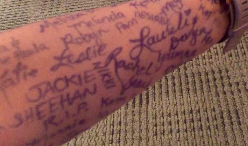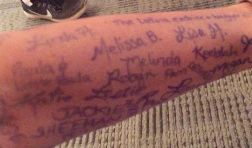 Lisa and I inked onto our skin the names of friends we’ve lost to domestic violence, those who are bullied and shamed, and those who are discriminated against because of lookism, sexism, racism, and homophobia, among others. Yes, I had men’s names bleeding into my skin, too, because Women’s Rights are Human Rights. And, of course, if you look you’ll see my daughter and daughter-in-law’s names on my arm. They were first. (There are other names written on the underside of my arm.)