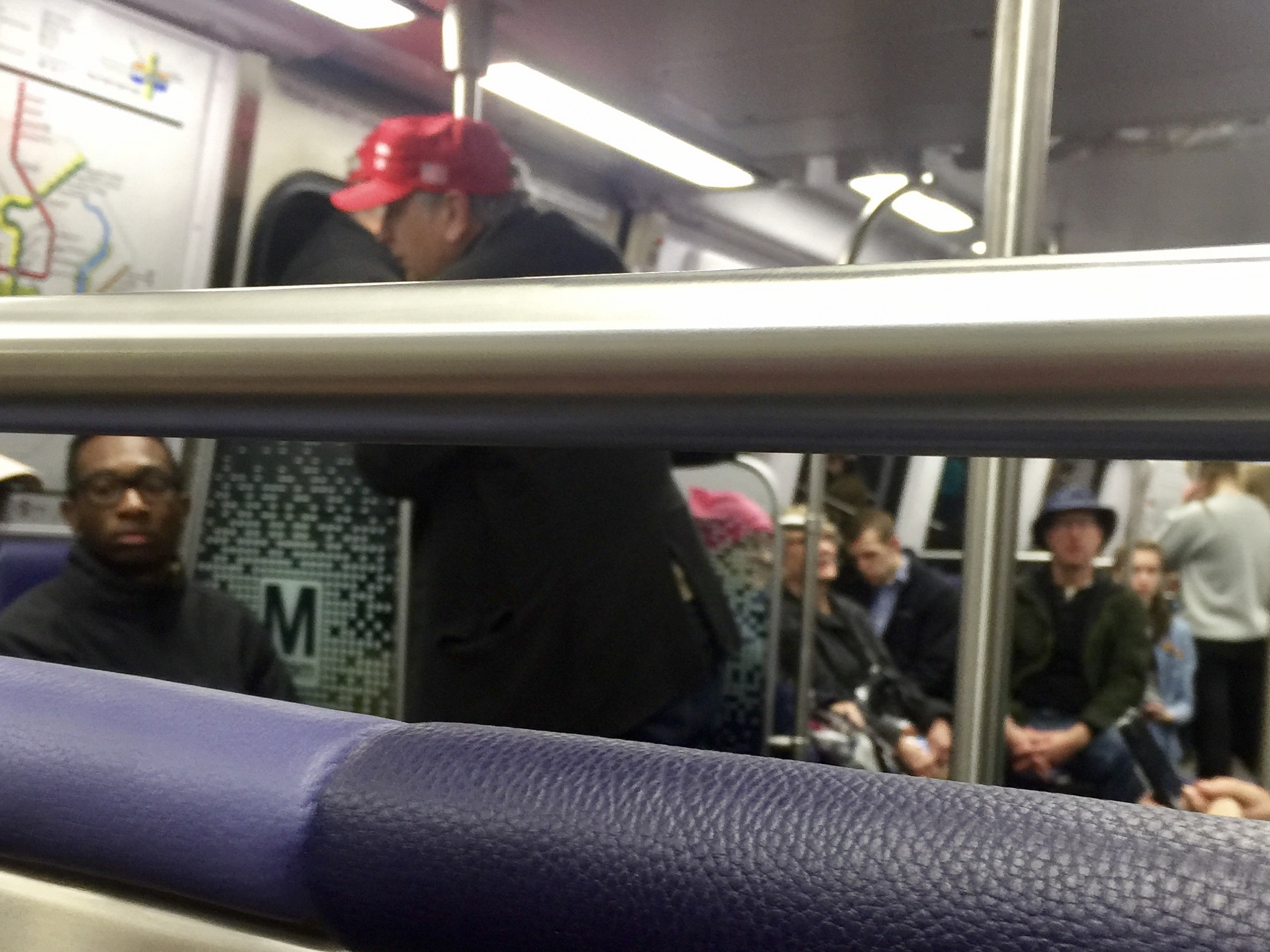 There were men who were asshats, as well. When we got onto the Metro at L’Enfant Plaza, the cars were empty. Then three Trumpeteers got on and hulked over the others on the train car, and bellowing about how great yesterday was compared to today. Because the other riders were not big, tall, white asshats wearing red hats. They were ruled by mob mentality and clearly meant to intimidate. But as the train traveled north on the Greenbelt Line, it filled up. The asshats were cramped like mice and were no longer in the majority, so they stopped their crap talk. Big men. Ha!