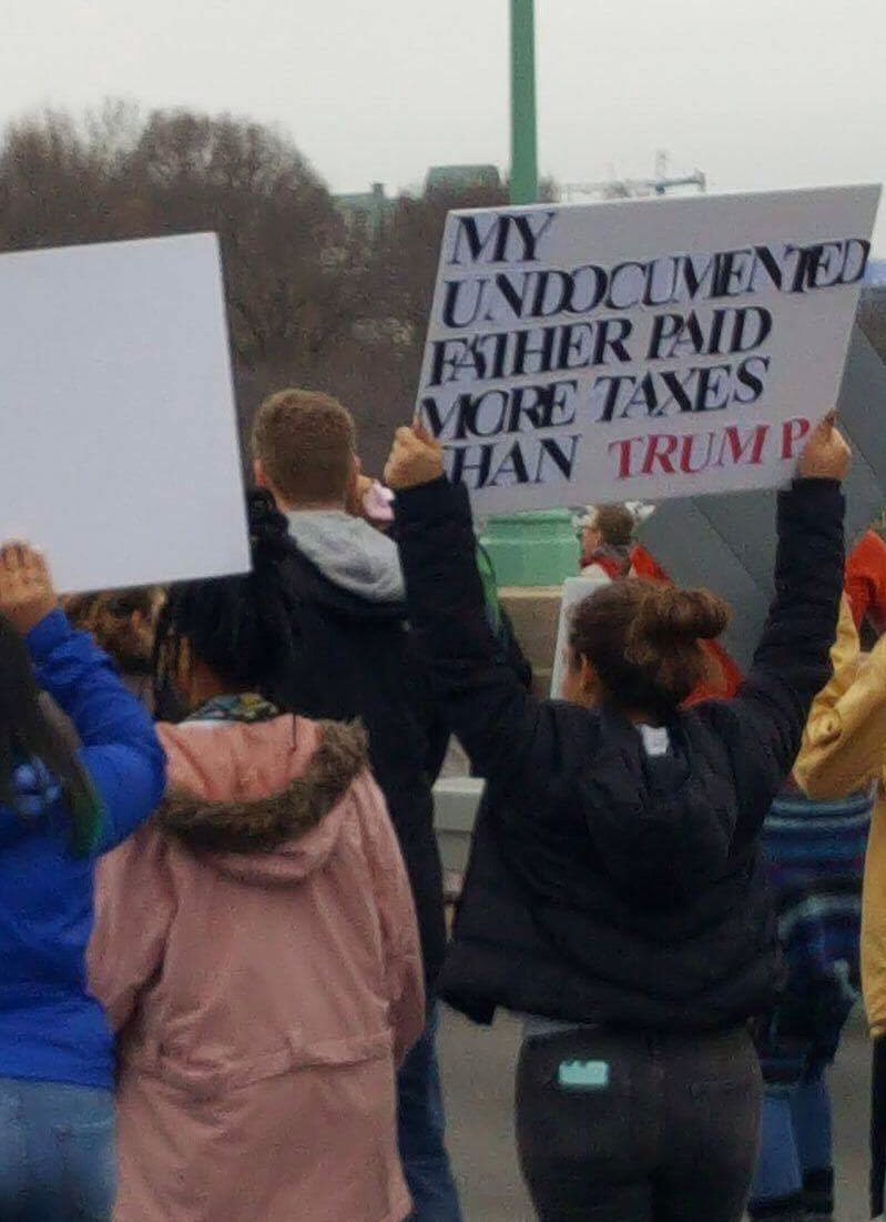I’d wanted to make a sign that said Immigrants Get the Job Done, praising the worth ethic many immigrants have. I often think of the mother of my childhood best friend, a woman who came to the U.S. from Puerto Rico with her two children, married a man who had two, and then had a child with him. He left her with all five kids one day, vanishing into thin air. She worked two full-time jobs and did more than make it through. When our power was turned off for nonpayment once, she let my mother run an extension cord to their apartment to keep our refrigerator running.