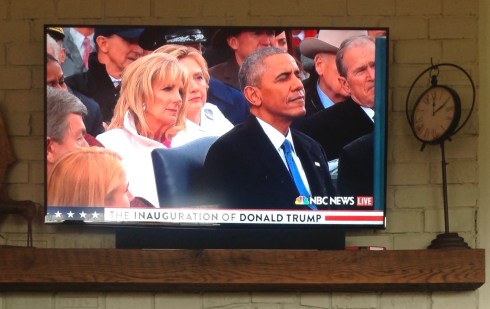 Lisa and I were in our socks, cozy in Vivica’s family room in front of a fireplace, watching the circus with her and her husband. Looking at this still I snapped, I’d caption it “Folks, I know this much about being president,” but what came out of his mouth was even more shocking than if he’d made that admission: He basically said “Folks, these guys knew this much about being president,” while he was surrounded by the former presidents he was dissing. That’s about the extent of the ugliness that I saw when I was at our Nation’s Capitol.