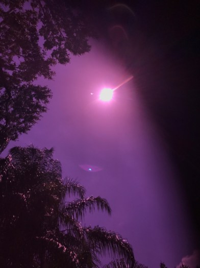 Then I remembered I had filters in my camera bag. I didn’t know what any of them were for. I picked out a gray one. The photo wasn’t much better. The purple one worked well enough; after snapping an iPhoto with it, I put it on the lens of my Nikon. Even with the purple filter, I wasn’t sure exactly what I was seeing. I know, I probably could have bought a special eclipse filter on Amazon, where I also could have gotten my eclipse viewing glasses. I’d been too busy blowing my nose. I’d had a cold, which was getting better, but I blame my incompetence on the cold because what else can I blame it on? Snot gets in the way. Next time you screw up, blame it on snot.