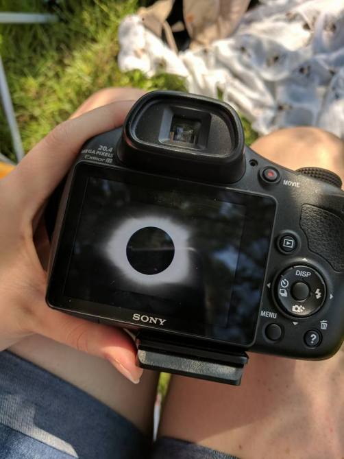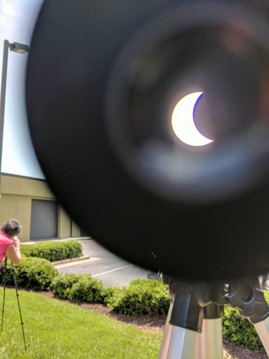 My husband set up our little spotting scope and had a talking app on his phone which called out what to look for and when based on our GPS coordinates and the progress of the moon slipping in front of the sun. The phone called out C1–the first point of contact–and a tiny arc of the sun disappeared.