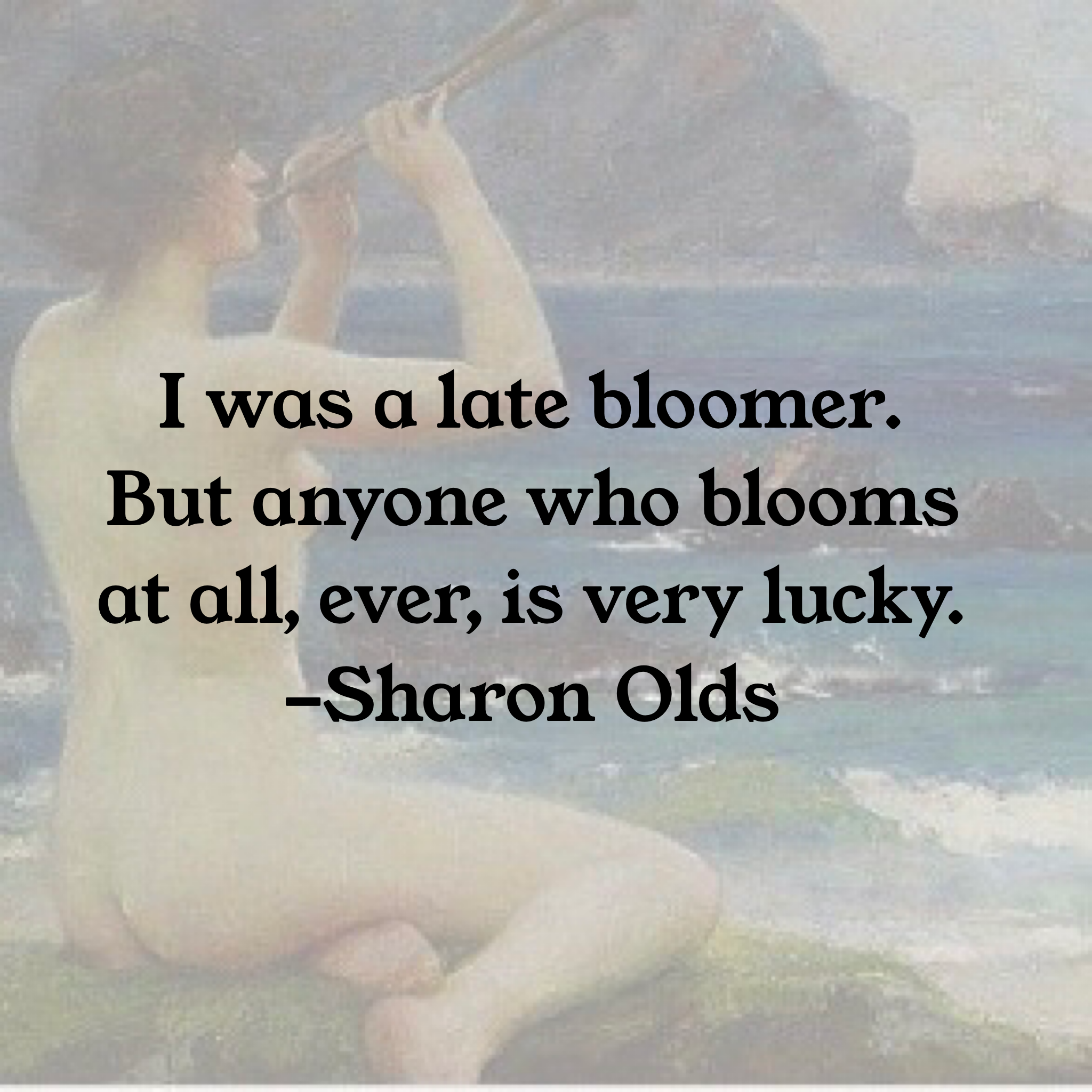 Love it. I’ve always thought of myself as a late bloomer–an MFA at 61!!! And I hold fast to the idea that it’s a lot happier to bloom late than to bloom early and then fade out. But yes, better late than never.