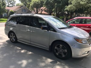 When Publix shopping associates would help wheel my groceries to the parking lot while the kids were at school, I’d say, “In what I’m sure will be incredibly surprising to you, we’re headed to a silver Honda Odyssey. The key is to find which one is mine.” My ride was not unique. It wasn’t surprising. It wasn’t fun. It was basically like me–comfortable, stable, and safe. No surprises. Reliable. Always there, waiting to be needed. The year after I got the second Odyssey, my girls changed schools. While once they had attended classes fifteen minutes down the road, they began going to a school over 45 minutes and a highway drive away. Over the past seven years I have racked up 120,000 miles on that van. I dropped off and picked up carpools. I sat in the van for hours, sometimes, waiting for the kids to get out of some extra-curricular activity or friends’ party that was too short to justify a trip home and back again. I never regretted getting the second van. I was able to drive everyone to everything–the kids, my husband, my mom and her partner, my father-in-law, friends . . . the van seated seven comfortably, eight safe as sardines.