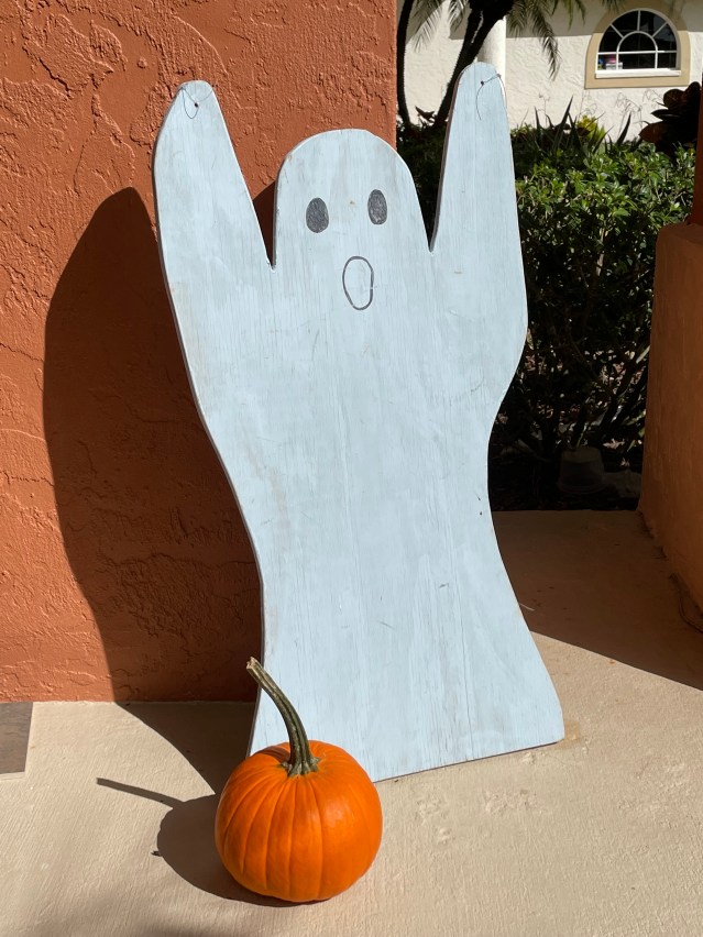 Halloween used to be my favorite holiday, even as an adult – costumes, candy, potential mayhem – in the best season of the year, complete with pumpkins and clever cobwebby decorations – what’s not to like? But as I get older and increasingly curmudgeonly, I chaff over any holiday, considering them all “enforced celebrations.” Nobody’s going to tell me when to have fun. Not at my age. Still I will admit, I was thrilled when I came home recently and was greeted at the front door by a familiar large light blue ghost. Years ago, my husband Rick had drawn and cut this phantom out of plywood. He asked our young daughter what color she wanted it to be. “Blue,” she immediately replied. “A blue ghost?” I asked. Rick painted his creation light blue and you know what? It worked. Now white ghosts look wrong to me. They, pardon the pun, pale in comparison. Ours has two sides: my favorite is the one that has an O for a mouth.