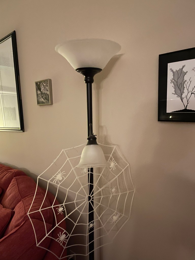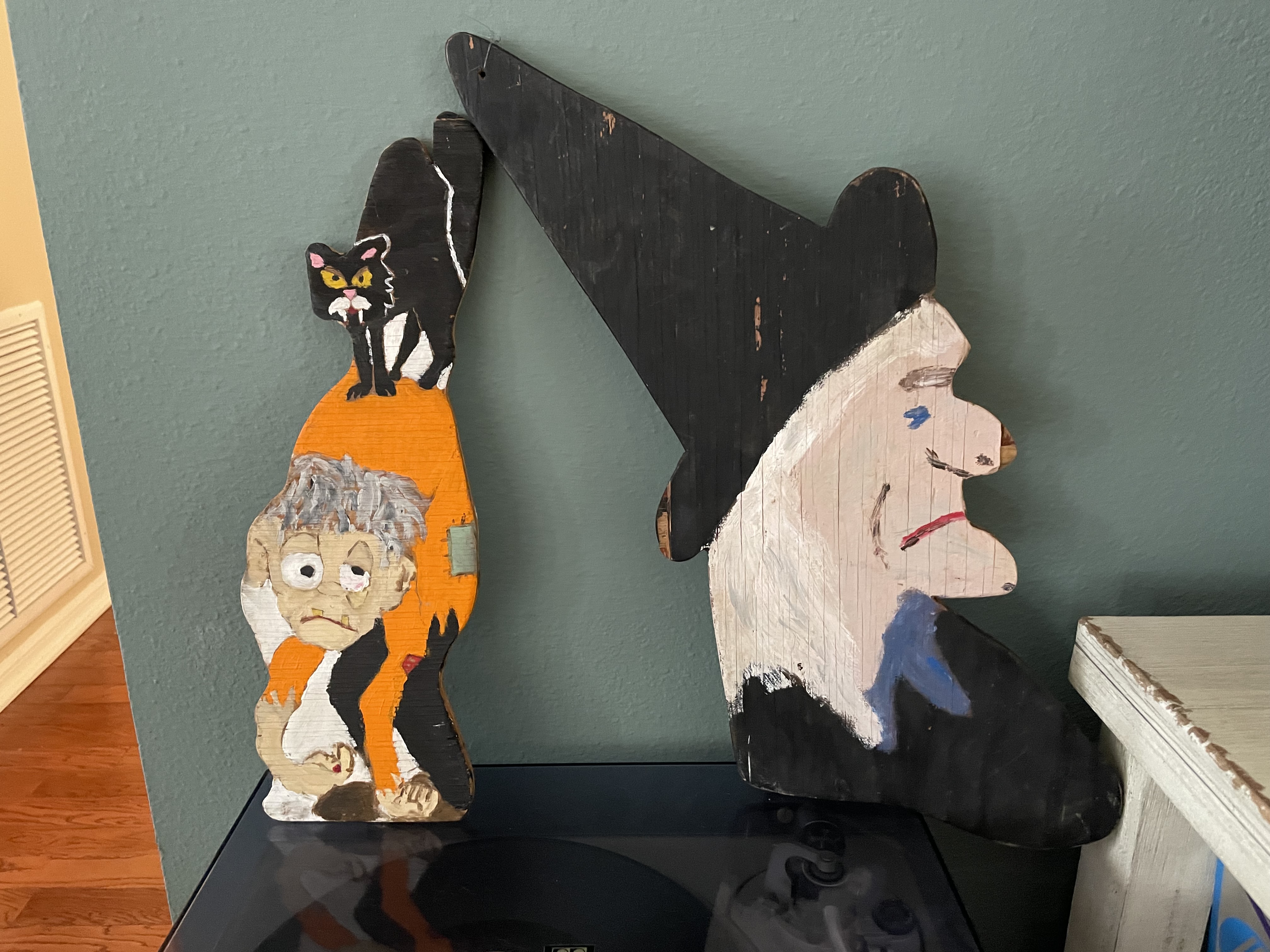 Rick also put up some other old Halloween decorations inside the house, including pumpkin lights, a black and orange garland on the lighting fixture above the dining room table, a large plastic spider web and the really amateurish plywood cutouts I painted decades ago for our young daughter, both politically incorrect: a hunchback with a wonky eye, a stereotypical witch with a wart on her nose – let’s face it, neither is a light blue ghost.
