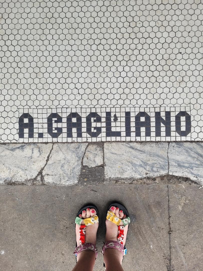 When we leave home to walk through the Marigny, we often end up on Frenchmen Street, known today for its live music venues, like the Spotted Cat and d.b.a. There’s also a bookstore, a bike shop, and restaurants, including Favela Chic, which has the best Guatemalan tamales and doesn’t open until seven at night. Reading Ellis’ book about the history of the Marigny partially solved a mystery for me. One day at the Frenchmen Grocery and Deli, I paused to look down and discovered a name spelled out in black tiles against the white hexagon tiled entrance: A. Gagliano. That’s my daughter’s name, April Gagliano! From Ellis’ book, I discovered the establishment was once known as Gagliano’s Dry Goods, though I still don’t know what kind of dry goods were sold there, clothing or furniture or flour, sugar, and salt, or some combination of the three.