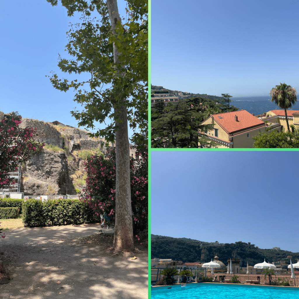 In Sorrento we were able to look around as we walked to a beautiful hotel where we had a rooftop lunch that was infinitely better than the one in Florence. There was wine–and it was breezy and cool enough to actually have a few glasses without feeling dizzy–salad, chicken, and a fantastic cheesecake for dessert. We were seated with a lovely family with two girls exactly our girls’ ages who had an almost identical story to ours–senior vacation delayed by pandemic. They were from Michigan, however, so they were not quite accustomed to the level of heat we were experiencing, and the mother was dreading seeing Pompeii with the blazing sun.