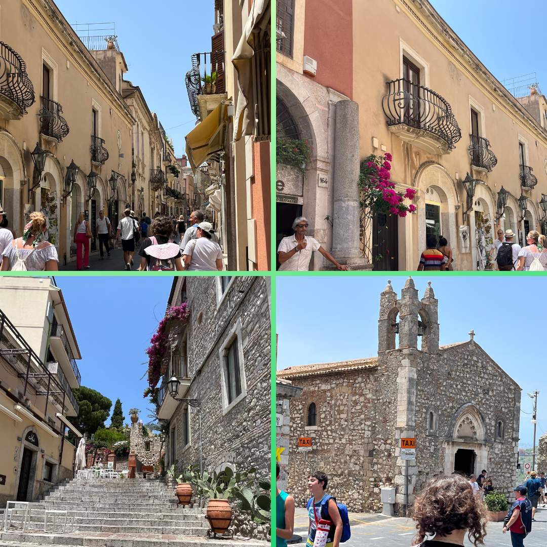 Once we arrived in Taormina the beset family set off to find a bathroom and a new shirt for the man. We also found a restroom where we could wash off the water. Then, we set off to explore. The city was absolutely delightful–rustic buildings, lots of flowers, cobblestone streets, open walkways, lots of stairs, shops, eateries, and all with a view of the Mediterranean. We stopped to do a little more shopping, as we found a lovely citrus-themed store with dishtowels, soap, candies, fans–everything a souvenir shop should have.