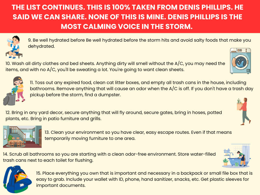 Unsuccessfully. Because on Monday night Milton reached speeds of 180 mph in the Gulf. That’s one of the highest speeds recorded . . . ever. But, my favorite weatherman Denis Phillips said that there was going to be a cold front coming in that would knock those speeds down, and in Denis I trust, so I tried to breathe through my anxiety. Unfortunately, the best way to access the fabulous Mr. Phillips is on Facebook, and I stupidly read the comments full of doubters telling us everyone who stayed were going to die.