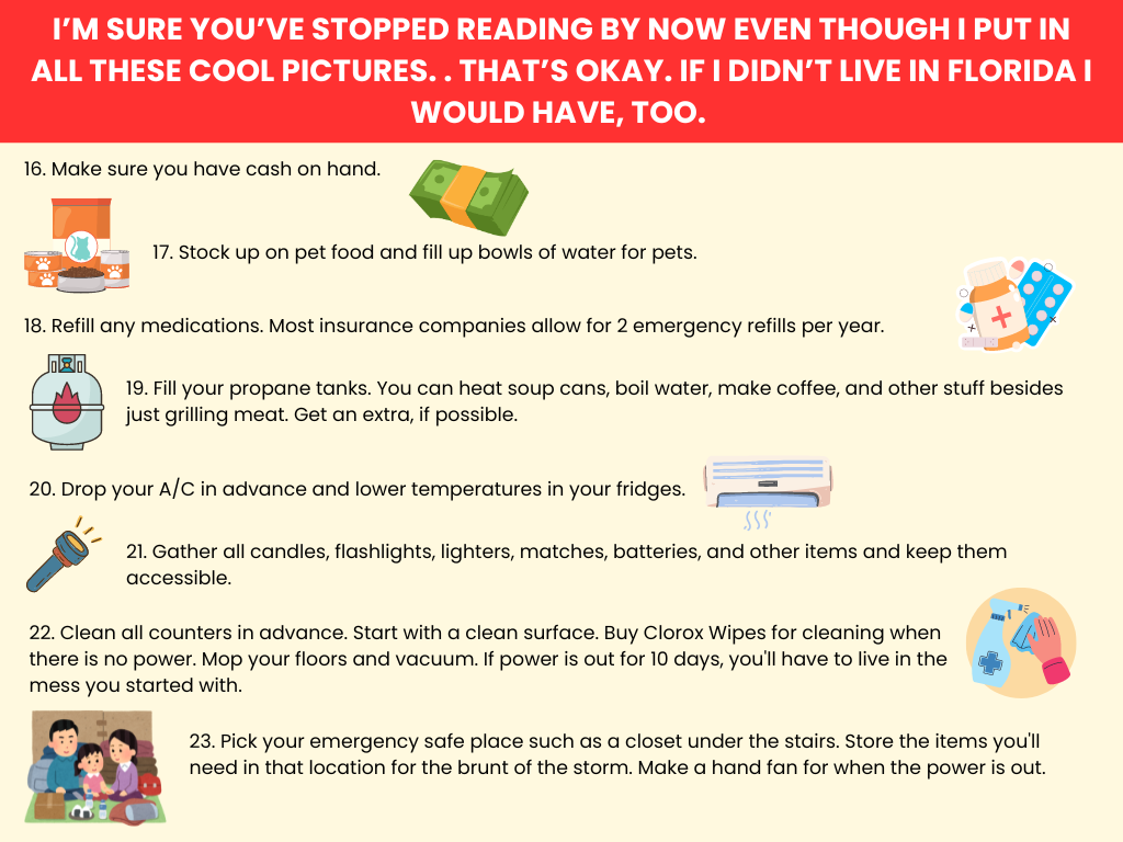 And also understand that an entire state cannot evacuate in three days. So if your loved ones decide to stay in the state and not drive or fly out, they are not crazy. So long as they are not in an evacuation zone on the coast of the peninsula, they have not been ordered to evacuate, and they tell you they are prepared to ride out the storm, just assume they’re doing what they judge is best. Because (though no one I personally know has ever done this to me, it has happened to others I know and love) to torture them with dire predictions of doom, when they already have those swirling around in their head, is making an already torturous situation almost unbearable for some and just an unnecessary distraction for others at a time when they need to focus.