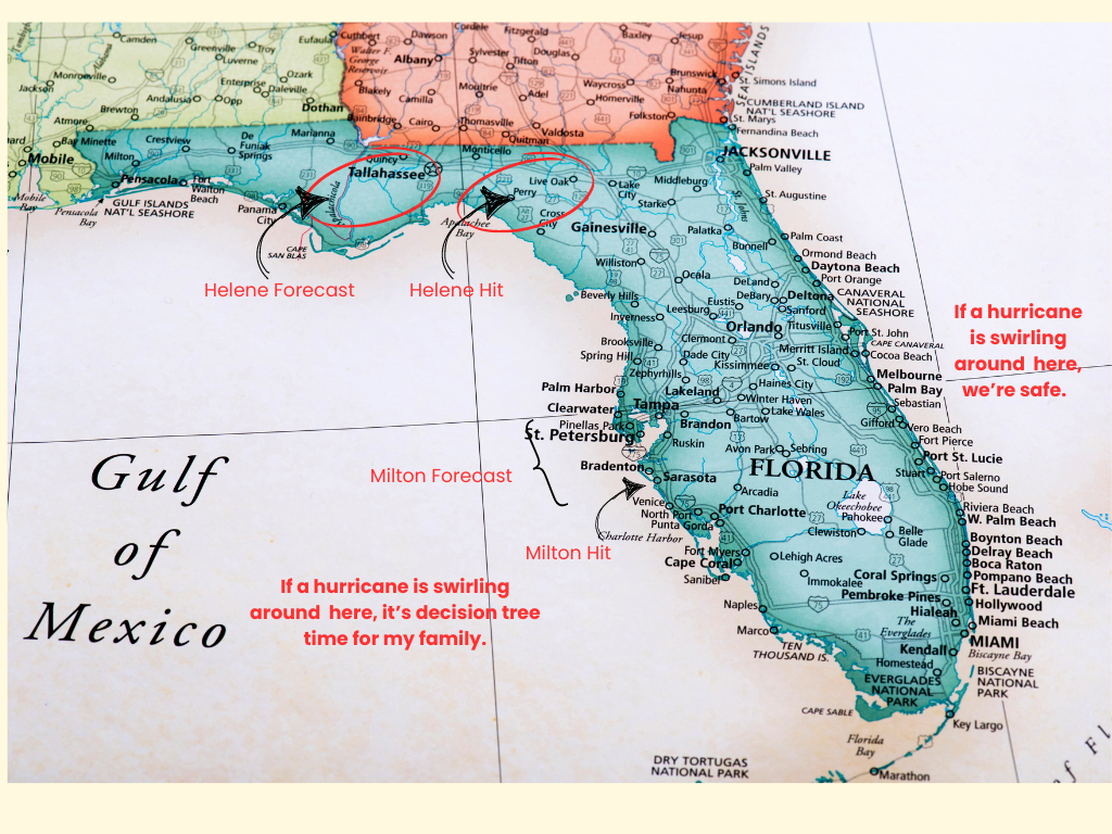 Two weeks before, Hurricane Helene was headed to Tallahassee. All the models agreed. We brought the kids home. And as it turned out . . . it did NOT hit Tallahassee. It made a “right turn” just a little sooner, and landed in an area that was severely impacted just last year. On the map, the closest city is Perry.